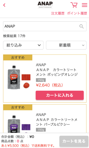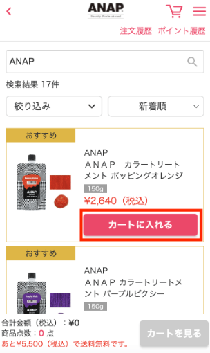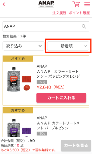「新着順」または「商品名順」のボタンを押すことで、検索結果を並び替えることができます。