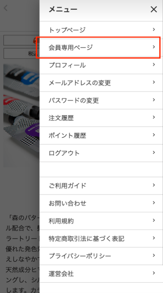 メニューバーを押し、「会員専用ページ」を押します。